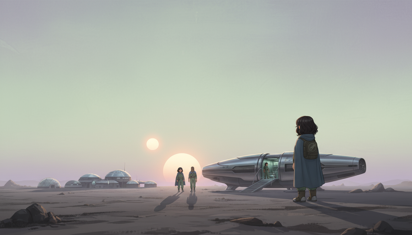 Her parents are already walking toward the settlement, their voices bright with something she doesn't feel. Behind her, the transport hums, preparing to lift back to orbit. She carries a bag of things from before—clothes, a reader, a flat stone from the old playground. Heavy things. Her mother turns back, smiling, gesturing. Come on, Kira. Come see your new home.