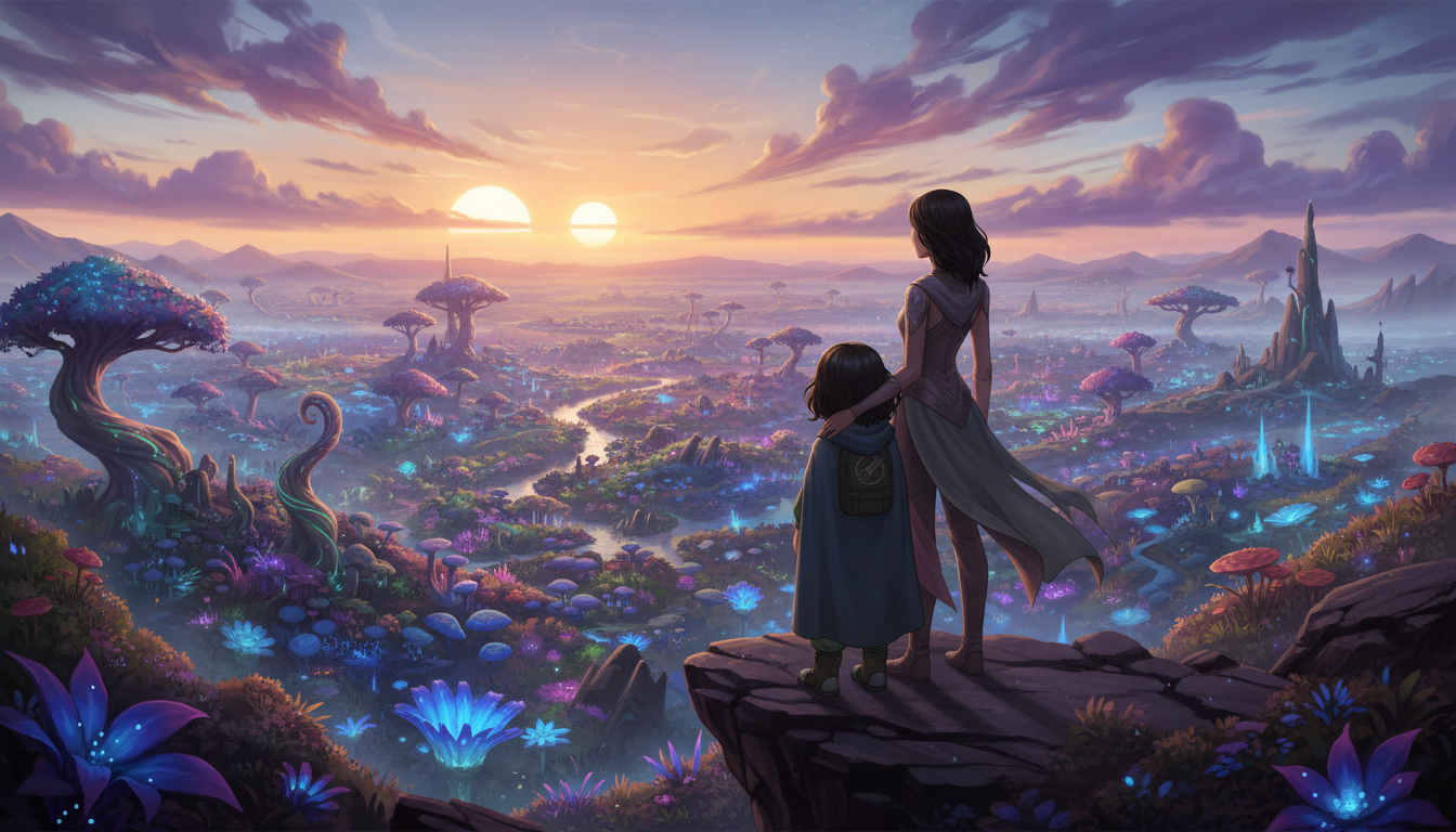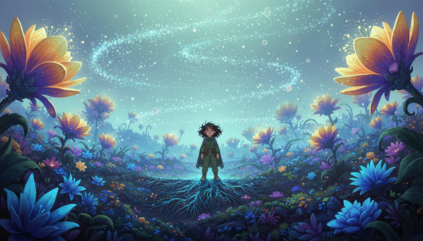 That's the only word for it. The ground thrums with bass notes too low to hear but felt in her bones. Plants chime as they open—actual chiming, crystalline and strange. The wind carries spores that whisper when they brush against each other. And beneath it all, a rhythm. A heartbeat.