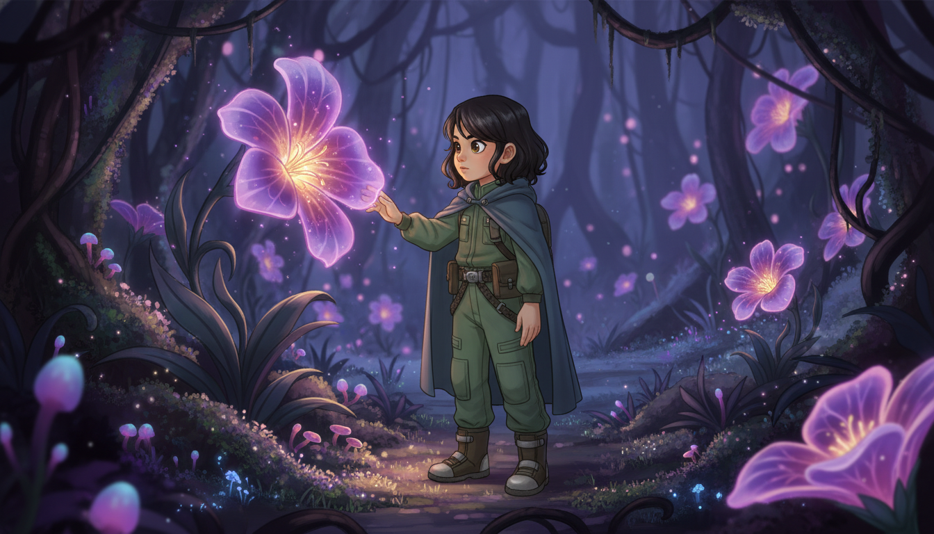 A vine uncurls at shoulder height, its spiral opening into a flower the size of her face. The petals are translucent, glowing from within, veined with darker purple. It smells like honey and ozone. She reaches out, stops, reaches again. Touches.