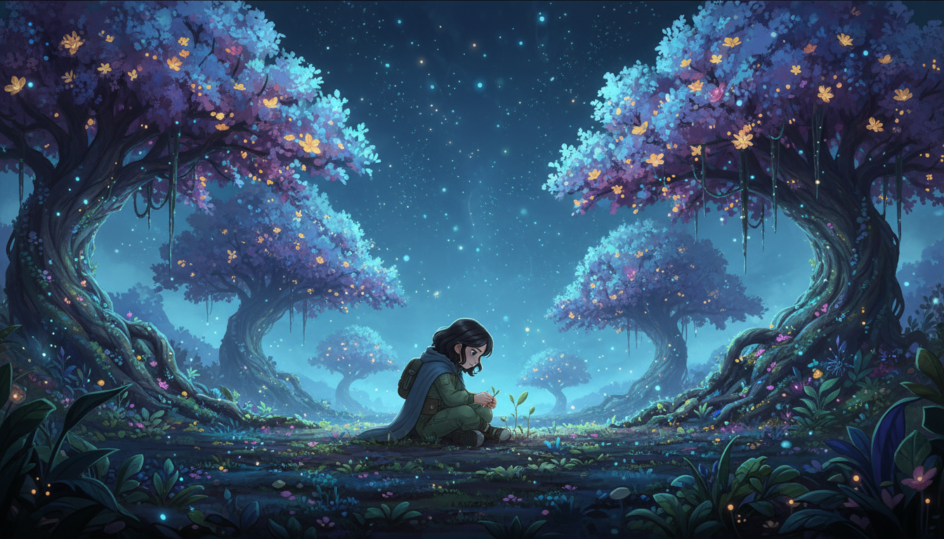 She looks out at the blooming world. At the ground beneath her feet—solid now, familiar in its unfamiliarity. At the sky that's pale green and violet and slowly turning colors she doesn't have names for yet. At the plants still glowing softly in the sunrise, holding onto night for one more moment.